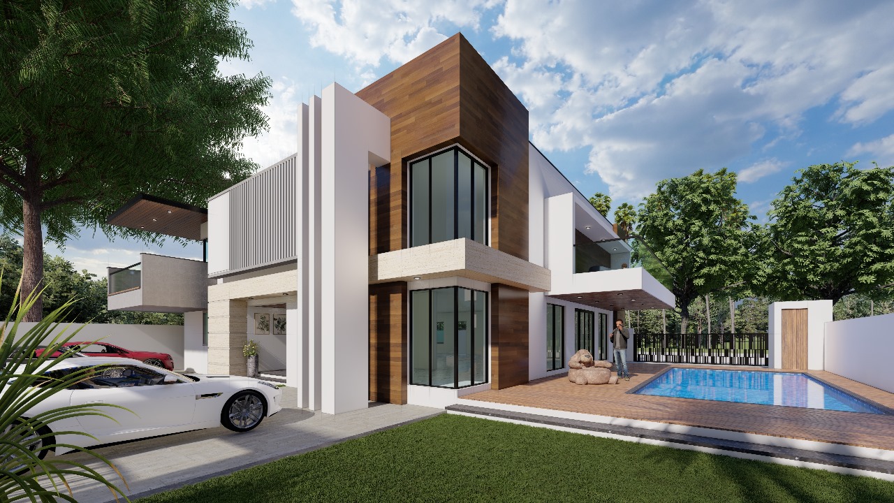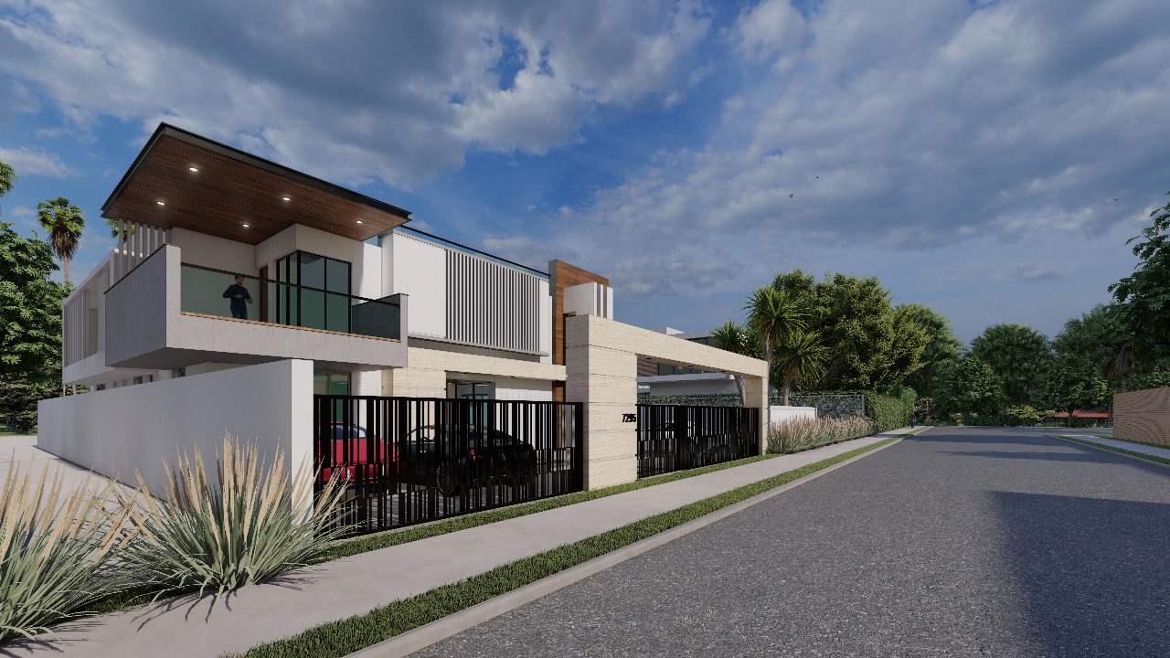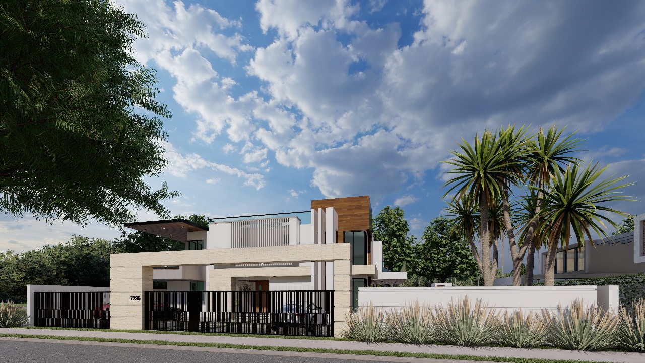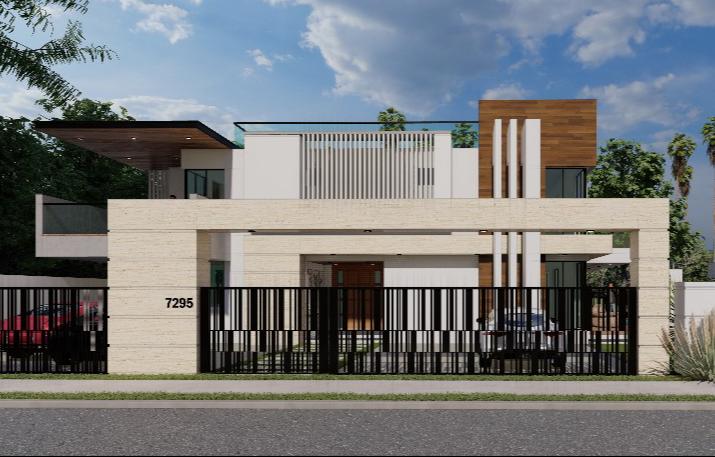 The Sharmila Residence showcases a modern architectural design with a clean and sophisticated elevation. The facade is characterized by a striking interplay of horizontal and vertical elements, creating a dynamic yet balanced appearance