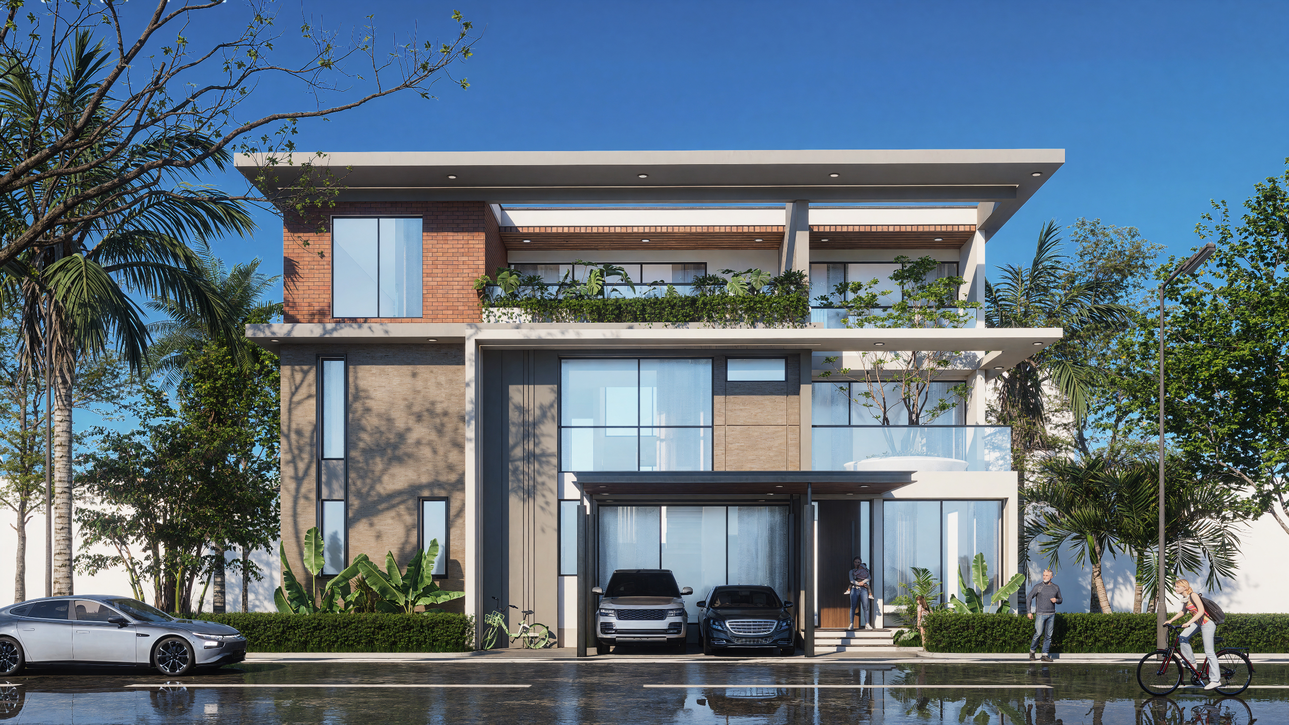 Double-height entrance zone with a cantilevered canopy, giving a grand and welcoming gesture. Integrated landscaping across floors, including balcony planters and terrace gardens, that promote biophilic living.